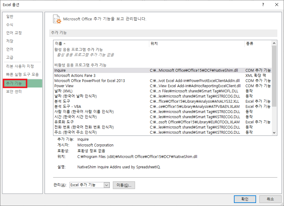 아래의 그림 7과 같이, '관리' 탭을 'COM 추가 기능'으로 선택합니다.
