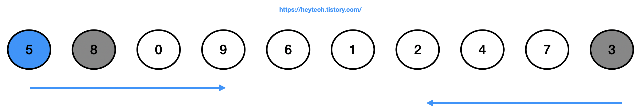 1) 전체 리스트 내 첫 번째 데이터인 5를 피벗으로 설정합니다. 이제 리스트 좌측에서 우측으로 피벗보다 큰 데이터인 8을 찾고, 리스트 우측에서 좌측으로 피벗보다 작은 데이터인 3을 찾습니다. 찾은 데이터의 위치를 서로 변경해 줍니다.